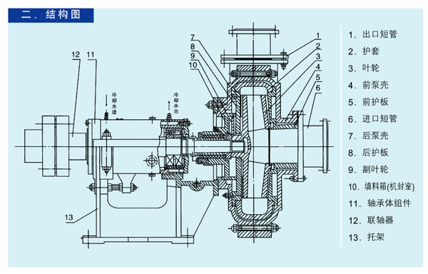 1、泵頭部分:GMZ型系列泵為雙泵殼結(jié)構(gòu),即前泵殼、后泵殼和帶有可更換的過流部分(包括葉輪、蝸殼、前護(hù)板、后護(hù)板)