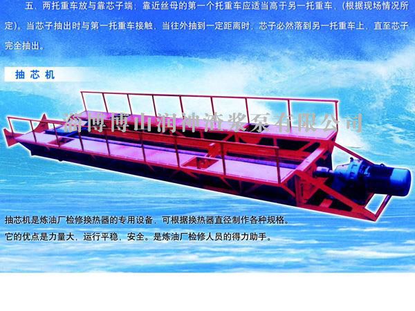 CHX型抽芯機(jī)是煉油廠檢修換熱器的專用設(shè)備,可根據(jù)換熱器直徑制作各種規(guī)格。 它是以Y系列電動(dòng)機(jī)和BWD型行星擺線針輪減速機(jī)作動(dòng)力,用梯型絲杠傳動(dòng),具有拉力大、抽芯平穩(wěn)、省力、省時(shí),不損壞芯子等特點(diǎn),經(jīng)實(shí)踐證明是煉油廠理想的換熱器檢修設(shè)備。 它的優(yōu)點(diǎn)是力量大,運(yùn)行平衡,安全。是煉油廠檢修人員的得力助手。