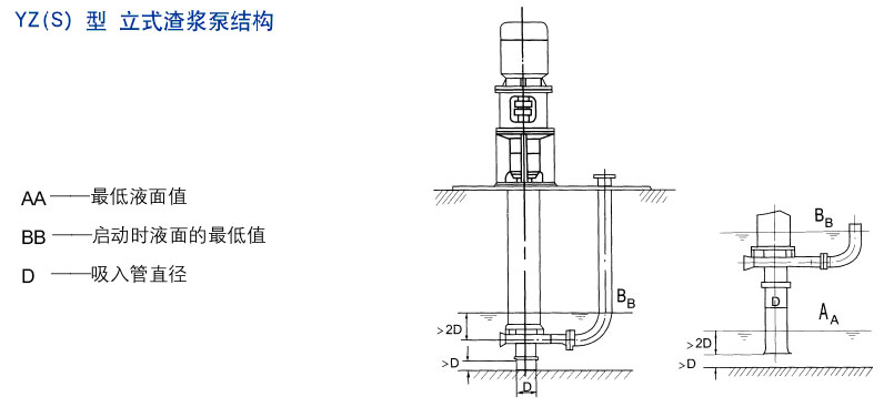 YZ (S) Pump is the cantilever pump structure of single stage and single suction, with the bearing housing, supporting, intermediate pipe connecting the pump hydraulic components, the water is discharged out from the drain pipe parts, pump impeller is for semi-shrouded with the agitating vane on the vane extended, the main characteristic of this pump is the underwater pump shaft parts have enough rigidity, the impeller and pump shell have no bearings, no shaft seal, which can transport the greater medium of solid particles. The length of inserting the water by pump is between 800 and 2000, the suction pipe can be matched in case of need. The shaft seal runs into the underwater pump without setting up the shaft seal, drive should be installed the vertical motor on the supporting seat connecting with coupling and pump.