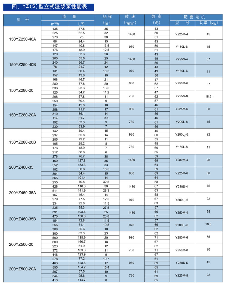 Ⅴ、YZ(S) Vertical slurry pump performance table